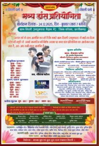 हरदीबाजार — ग्राम पंचायत सिरली (स्कूलपारा मैदान) में बुधवार 24 दिसंबर 2025 को सायं 7 बजे से एक भव्य डांस प्रतियोगिता का आयोजन किया जाएगा। यह कार्यक्रम स्वर्गीय धीरज पटेल की स्मृति एवं उनके जन्मदिवस के विशेष अवसर पर आयोजित किया जा रहा है, जिसमें क्षेत्र के युवा कलाकार अपनी नृत्य प्रतिभा का शानदार प्रदर्शन करेंगे।कार्यक्रम को लेकर ग्राम सिरली सहित आसपास के ग्रामीण अंचलों में खासा उत्साह देखने को मिल रहा है। प्रतियोगिता में सामूहिक नृत्य एवं युगल नृत्य की आकर्षक प्रस्तुतियां होंगी। आयोजकों द्वारा विजेताओं के लिए आकर्षक नकद पुरस्कार एवं शील्ड की व्यवस्था की गई है।
