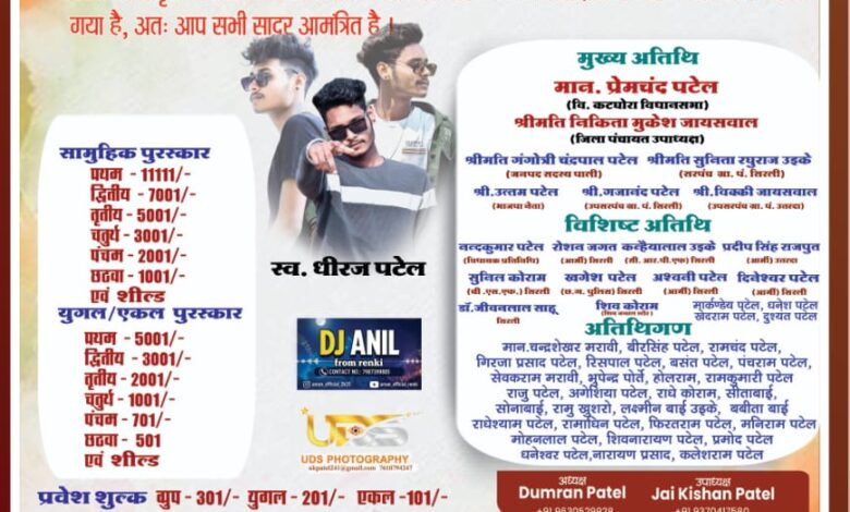 (सभी विजेताओं को शील्ड प्रदान की जाएगी) प्रवेश शुल्क ग्रुप डांस — ₹301/- युगल डांस — ₹201/-एकल (एंट्री पास) — ₹101/-इस आयोजन के मुख्य अतिथि कटघोरा विधायक प्रेमचंद पटेल होंगे। वहीं जिला पंचायत उपाध्यक्ष निकिता मुकेश जायसवाल, जनपद सदस्य गंगोत्री चंद्रपाल पटेल, सरपंच सुनिता रघुराज सिंह उइके सहित अनेक जनप्रतिनिधि,गणमान्य नागरिक एवं सामाजिक कार्यकर्ता कार्यक्रम की गरिमा बढ़ाएंगे।आयोजन समिति के अनुसार प्रतियोगिता में भाग लेने वाले प्रतिभागियों को अपने गीत व डांस से संबंधित सामग्री स्वयं लानी होगी। कार्यक्रम की सभी तैयारियां पूर्ण कर ली गई हैं।आयोजकों ने क्षेत्रवासियों से अधिक से अधिक संख्या में पहुंचकर कार्यक्रम को सफल बनाने की अपील की है।यह डांस प्रतियोगिता न केवल ग्रामीण व क्षेत्रीय युवा प्रतिभाओं को मंच प्रदान करेगी, बल्कि स्वर्गीय धीरज पटेल की स्मृति को चिरस्थायी बनाए रखने का एक सराहनीय प्रयास भी साबित होगी।